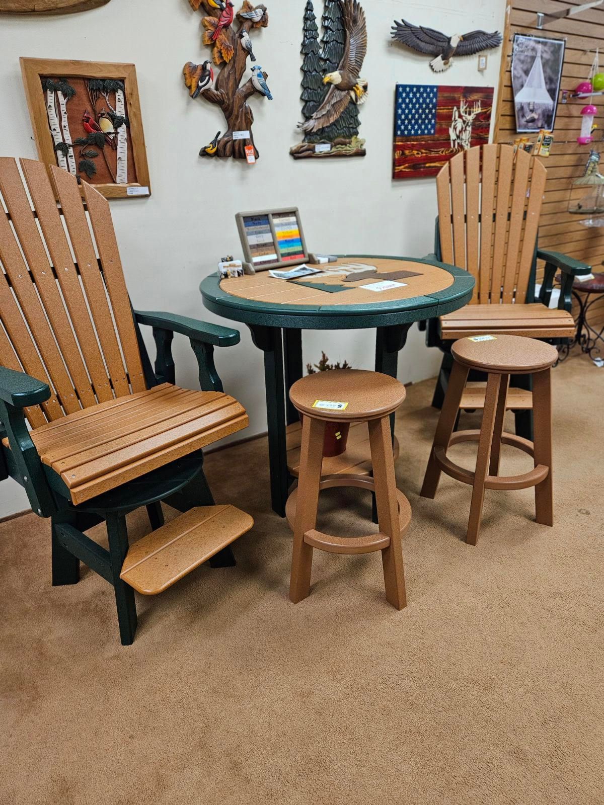 - Height and bar height tables- 42"-72", Tete-A-Tete adirondack table, Tete-A-Tete table, and Fire table